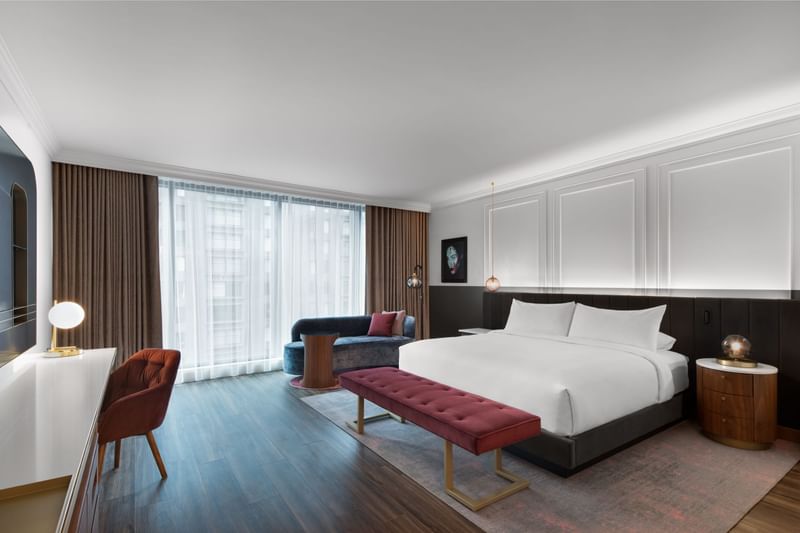 L'élégance et le confort de ces chambres créent un espace intime pour se détendre après une journée de voyage, de réunions ou d'exploration de Montréal. Avec son style Art déco et la lumière naturelle qui filtre à travers de grandes fenêtres, cette chambre offre tout ce qui est nécessaire pour travailler ou se détendre dans le confort.